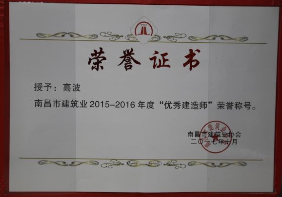 南昌市建筑業(yè)協(xié)會對公司頒發(fā)了南昌市建筑業(yè)2015-2016年度“先進(jìn)企業(yè)”榮譽(yù)稱號,對公司建造師章壽榮、何靜、胡建平、高波頒發(fā)了南昌市建筑業(yè)2015-2016年度“優(yōu)秀建造師”榮譽(yù)稱號;中國建筑業(yè)協(xié)會對章壽榮頒發(fā)了全國建筑業(yè)企業(yè)優(yōu)秀項(xiàng)目經(jīng)理榮譽(yù)稱號。