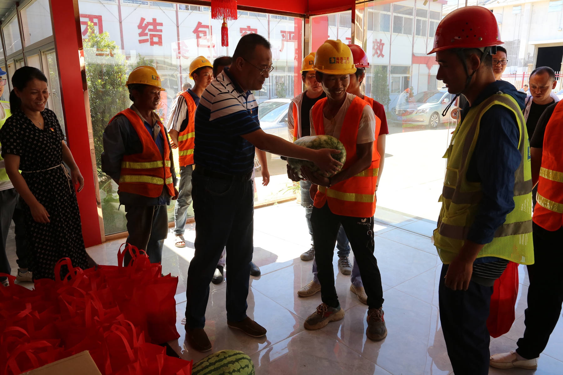 烈日炎炎,持續(xù)高溫。為了給奮戰(zhàn)在工程一線的廣大員工帶去企業(yè)的關(guān)懷,7月22日,公司相關(guān)部門在南旅建工集團(tuán)總經(jīng)理、公司黨委書記、董事長王彥,南旅建工集團(tuán)黨委副書記、常務(wù)副總經(jīng)理龔戩,公司紀(jì)檢書記王小華、工會(huì)主席付蓉等領(lǐng)導(dǎo)率領(lǐng)下,先后來到“繩金塔民俗風(fēng)情街”工程項(xiàng)目部、“滕王閣南擴(kuò)”項(xiàng)目部及“南昌市第六糧庫易址重建”工程項(xiàng)目部,開展“我為群眾辦實(shí)事 炎炎夏日送清涼”活動(dòng)。每至一處,送上大批西瓜、綠豆、冰糖等防暑物品及藥品,并詢問項(xiàng)目部防暑降溫工作落實(shí)情況,督促項(xiàng)目部把工程建設(shè)與職工健康安全同時(shí)抓牢實(shí),確保項(xiàng)目建設(shè)正常推進(jìn)。